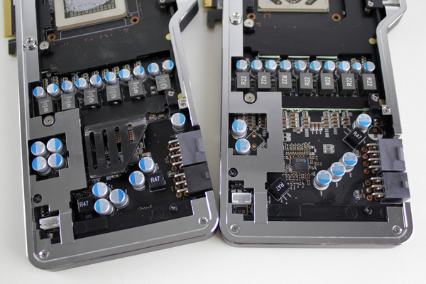 In case you missed it, the Hawaii GPU has a different orientation on the PCB, which is easy to spot looking at the extruded part of the heatsink base.