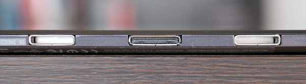 Of course, this is still a cheap device, so there’s no brushed aluminium, magnesium or tough polycarbonate. Aside from the Gorilla Glass covered screen and the rubberized back of the keyboard dock, everything else you happen to touch is plastic. The back features a high-gloss finish with Asus’ trademark concentric circle texture under the finish. Don’t let the pattern fool you, the finish is as smooth as glass. The texture is under the finish, not a part of it. Needless to say this is an invitation to smudges and fingerprints.