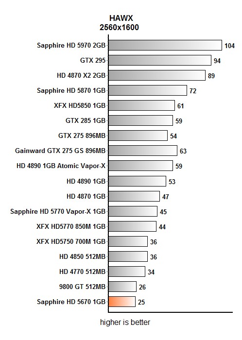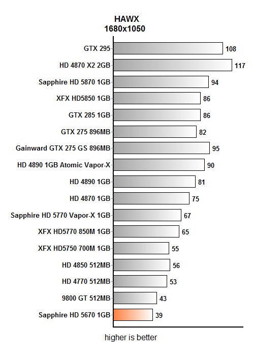 HAWX is a DX 10.1 game, but don't forget that Nvidia's GT 240/220 cards feature DX10.1 support. Radeon HD5670 and Geforce GT 240 cards are running pretty much on par. Good news is that the HD5670 will allow for gaming even at 1920x1200.