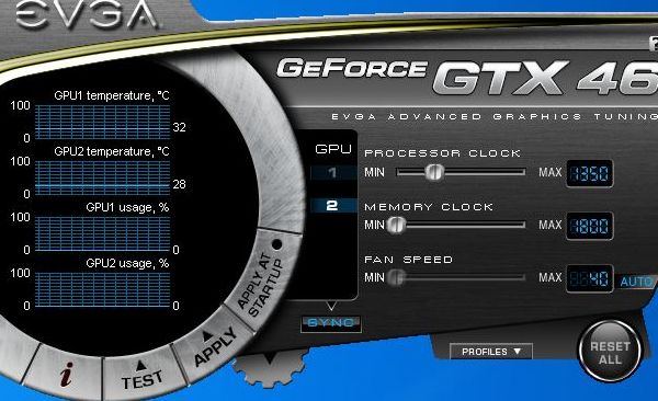 We tested 2-way SLI with two EVGA GTX 460 768MB cards – one of the Superclocked, the other running at reference clocks. We first showed results of the GTX 460 SLI at reference clocks, and we did that by downclocking EVGA’s Superclocked to reference clocks. Note however that this step is done automatically as the case of two cards at different clocks running in SLI will automatically result in the faster card downclocking to match the slower card. We then show GTX 460 SLI results at Superclocked clocks, which we made by using EVGA’s Precision to overclock the reference card to 763MHz for the GPU and 3800MHz for the memory.