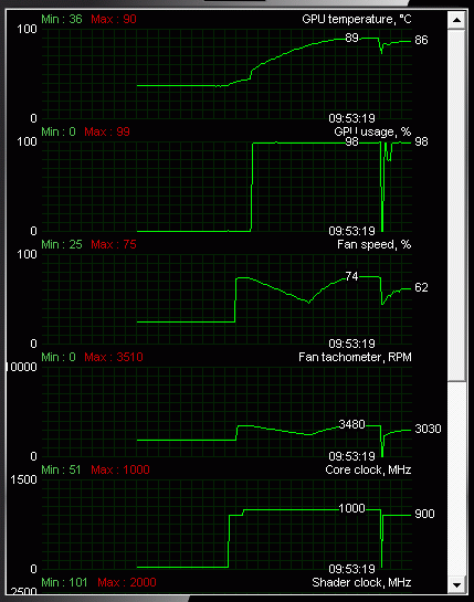 Afterburner recorded an interesting thing -- after the instability caused by the 1000MHz clock, the card downclocked to 900MHz. The app we were running at the time didn't crash.