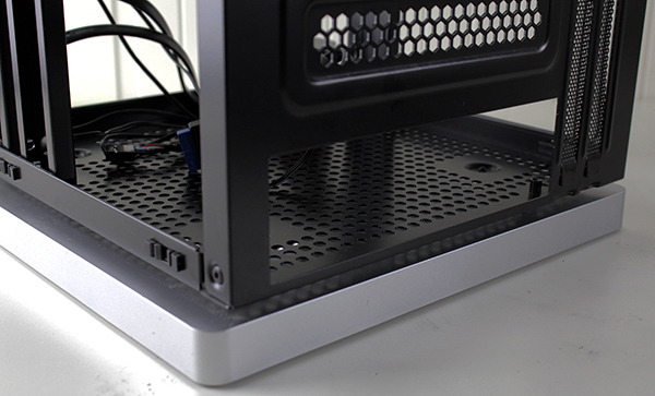 The silver base is about 2cm tall. It is plastic, but it feels sturdy and the silver finish is a nice touch. The metal chassis is connected to the base on all four corners and the 8mm gap allows the chassis to get a fair bit of air.