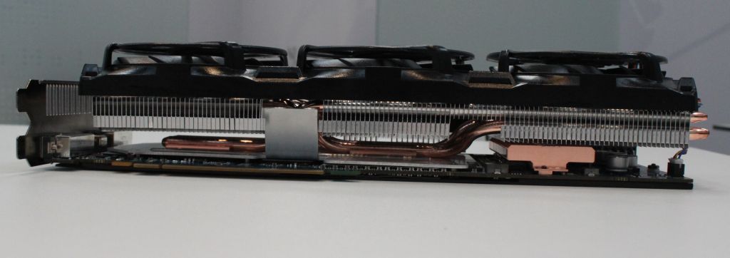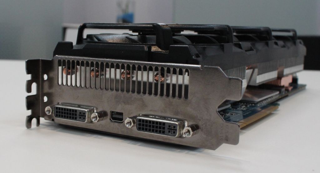 The GPU runs at 850MHz, while the memory is clocked at 1200MHz (effective 4800MHz). This is enough for 22K in Vantage Performance. The I\O panel features two dual-link DVIs plus one mini DisplayPort output.