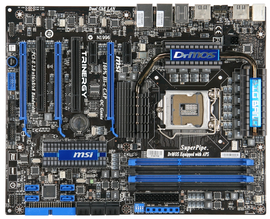 Another new thing about MSI's P55 Trinergy is the QuantumWave audio processing, which supports the latest THX TruStudio PC and Creative's EAX Advanced HD 5.0. The rest of the features include 100% Hi-c Caps, MSI's OC Genie and SuperPipe, an 8mm heatpipe cooling design.