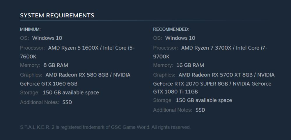 The big surprise is that the game will need 150GB of available storage space, and according to GSC Game World, SSD storage is recommended. It will need Windows 10 OS.