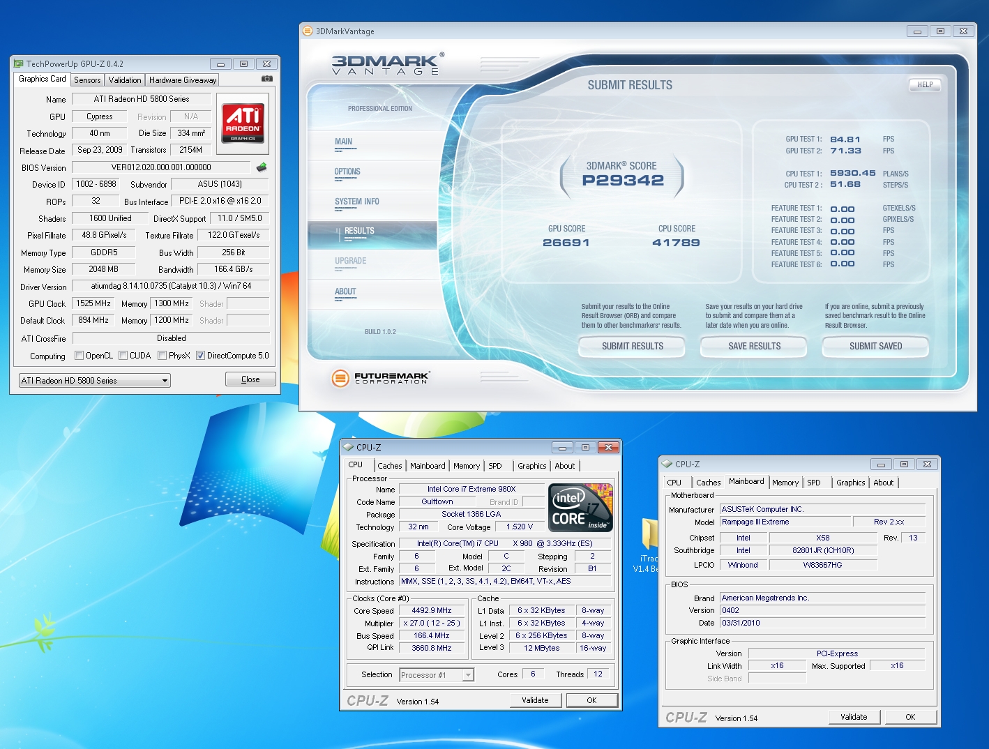 The rest of the setup included Intel's Core i7 980X Extreme Edition running at 4492.9MHz and at 1.52V, Asus Rampage III Extreme motherboard, 6GB of Corsair Dominator GTX DDR3 memory and powered by Antec 1200W PSU.