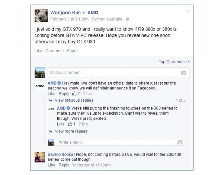 Today, AMD used its official Facebook page to confirm the Radeon R9 300 series is indeed coming soon as the company is "putting the finishing touches on the 300 series to make sure they live up to expectation," and that they "can't wait to reveal them."