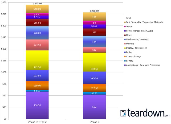 .An analytic company that goes under the name of teardown.com has singled out the companies who got the design win with their chips and tech in iPhone 6S and it managed to estimate the Bill of Materials Cost. The BoM is a magical number that tells you how much these components and the assembly work cost.