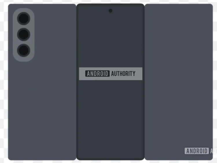 The renders show a device with three panels. The left-most rear panel houses a triple-camera setup in a layout that smells a lot like existing Galaxy Z Fold hardware. The middle panel is likely the outer display, with a front-facing camera clearly visible for those important folded-state selfies. The right-most bit looks display-free, suggesting it’s more of a backing slab than something interactive.