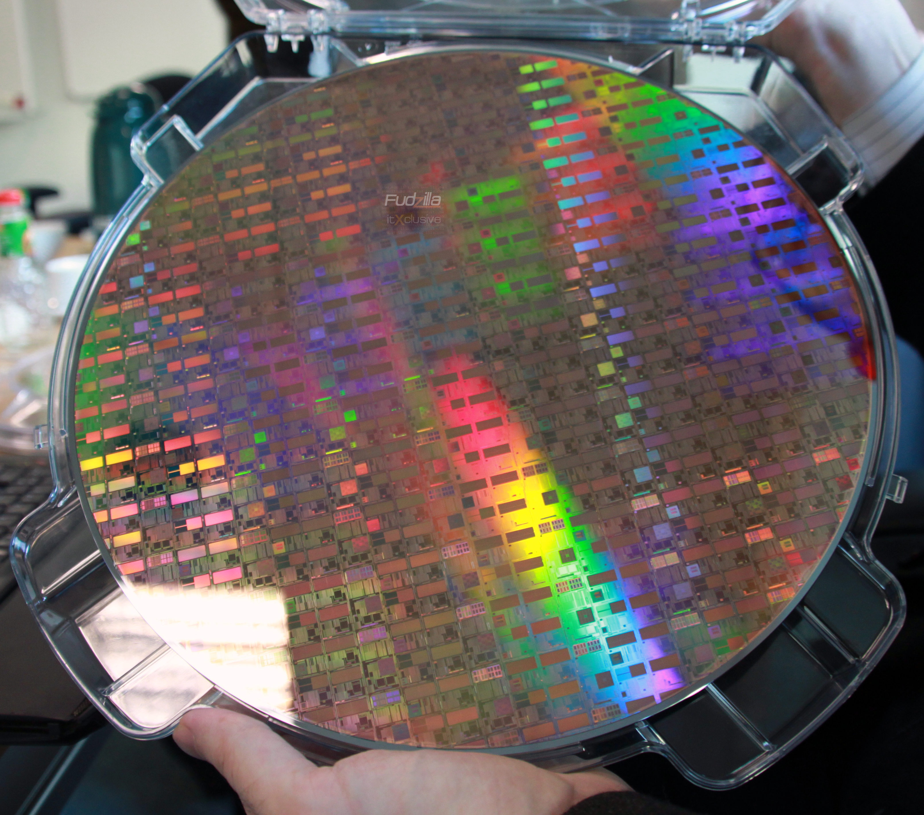 We had a chance to take a picture of one of the first publicly showcased 32nm wafers. It was made in Globalfoundries' Dresden Fab1 and it is a test 300mm wafer containing some core logic and memory chips. These are not real products, they are the result of a test production run and part of the learning curve how to get 32nm ready for clients in 2010.