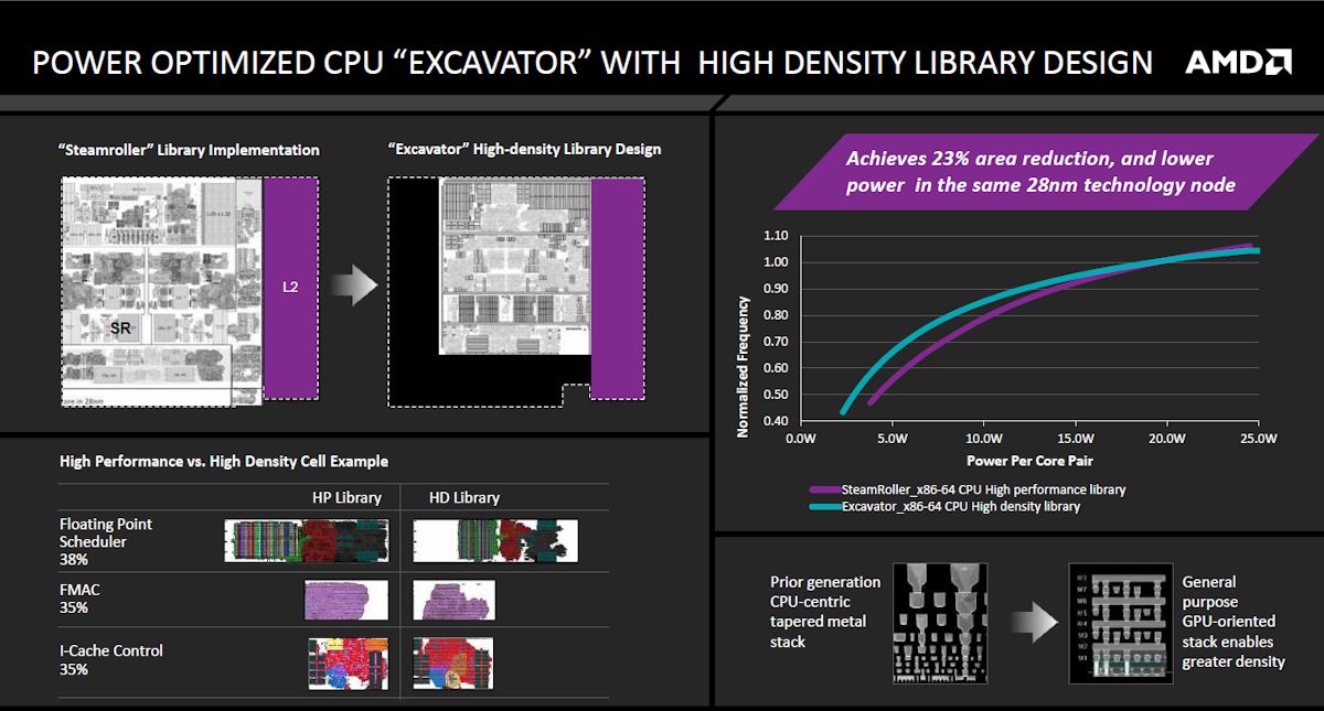 AMD claims the new high density design library results in 29% more transistors than Kaveri, with a whopping 3.1 billion transistors on the same die area. Excavator cores are said to offer a 5% IPC gain, but they need 40% less power and take up 23% less area than Kaveri’s Steamroller cores.
