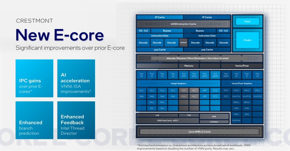 Compute tile – Contains the latest-generation E-cores and P-cores, both of which introduce new microarchitecture enhancements. This tile is built on Intel’s next-generation Intel 4 process node, bringing major advancements in power-efficient performance. This is a tick momentum as the E cores and P cores are largely based on the Gen 13 design. The Meteor Lake cores that found its place in the Meteor Lake compute tiles are Redwood Cove P-cores (Performance) and E-core energy-efficient Crestmont cores. The Meteor Lake core design is largely based on last year’s Raptor core performance core and Gracemont efficient cores.