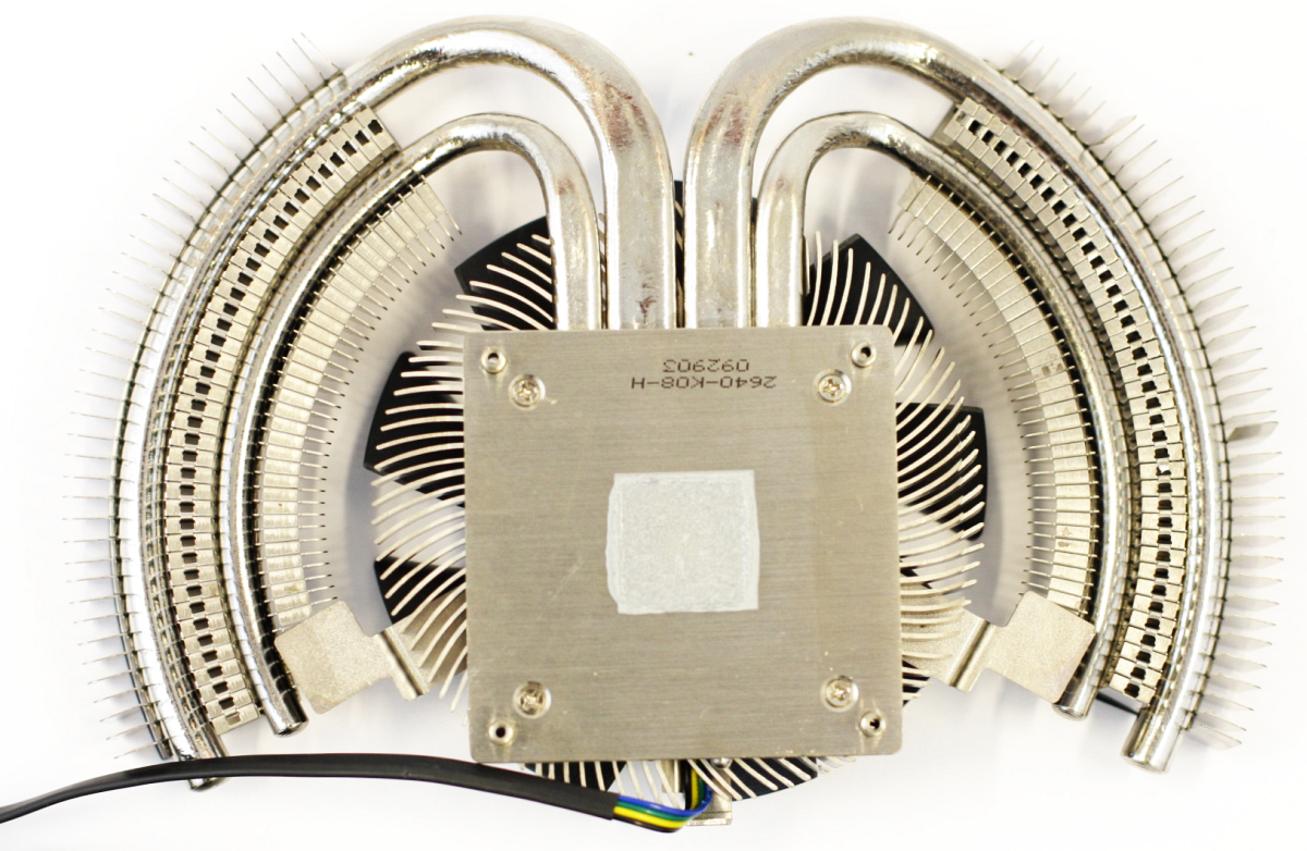 The Cyclone cooling’s heatpipes start at the large base, which leans on the GPU, and travel in a semicircle around the fan, and thus they’re cooled at every point. Since there are two heatpipes on each side of the GPU, MSI handled this by elevating the SuperPipe and placing it at about 2cm above the PCB. Such moves resulted in a card that is about 13cm high.