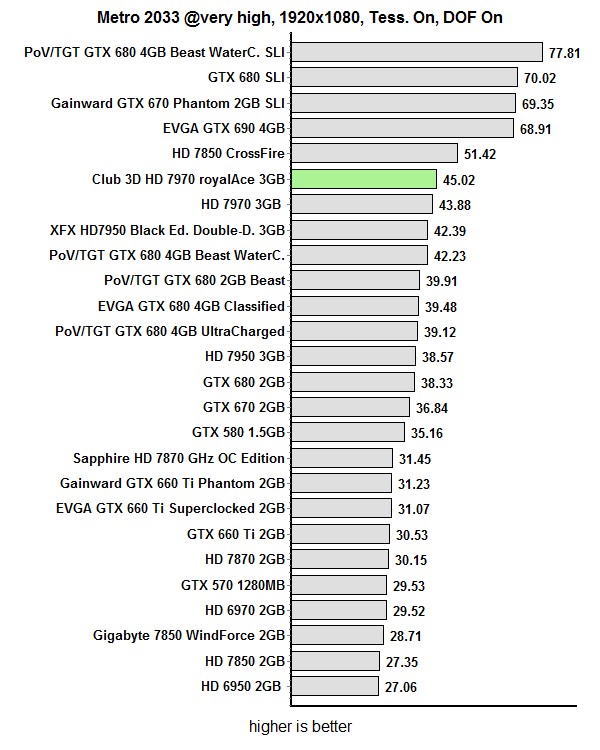 Index Club 3D HD 7970 GHz royalAce Edition reviewed Packaging A closer look at HD 7970 royalAce Testbed 3DMark11 Crysis 2 Aliens vs Predator Metro 2033 Tessellation: Heaven Overclocking Thermals, Noise, Consumption Conclusion All Pages Page 8 of 12 Metro 2033 « Prev Next »